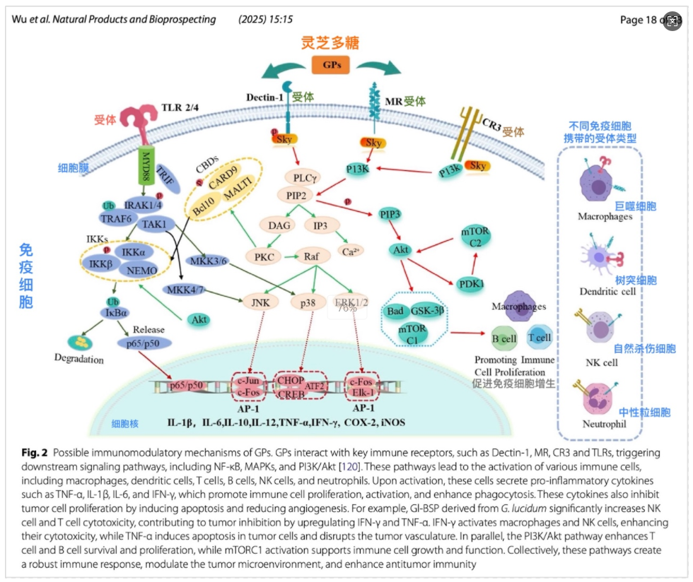 图4撷取自中国科学院昆明植物研究所邱明华研究团组今年(2025)3月刚发表在《Natural Products and Bioprospecting》(应用天然产物)的综述文章,该图根据目前已知的研究成果,描绘了免疫细胞在被灵芝多糖活化后,细胞内部信息网络忙碌运作的场景,可以帮助我们更好理解灵芝多糖是怎么调控免疫细胞的。