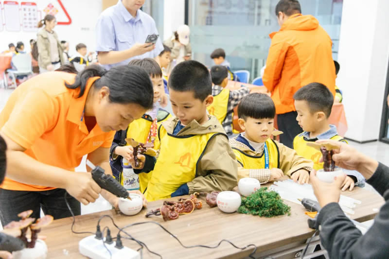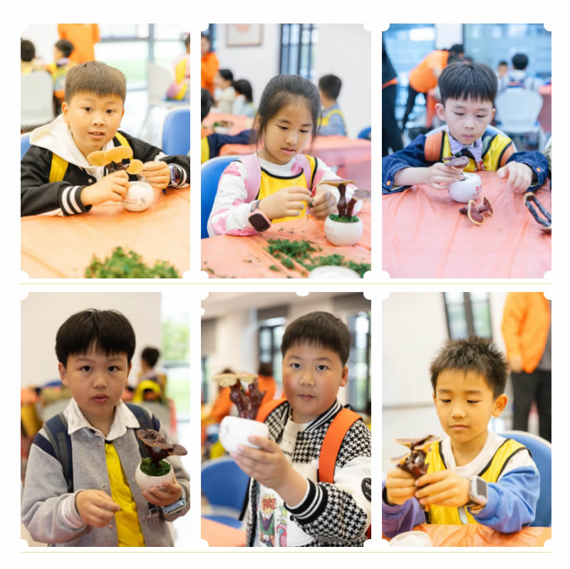 在灵芝盆景手作环节,小学员们纷纷化身小小园艺师,专注地投入创作。他们时而皱眉思考,时而开心交流,完全沉浸在手工的乐趣中。