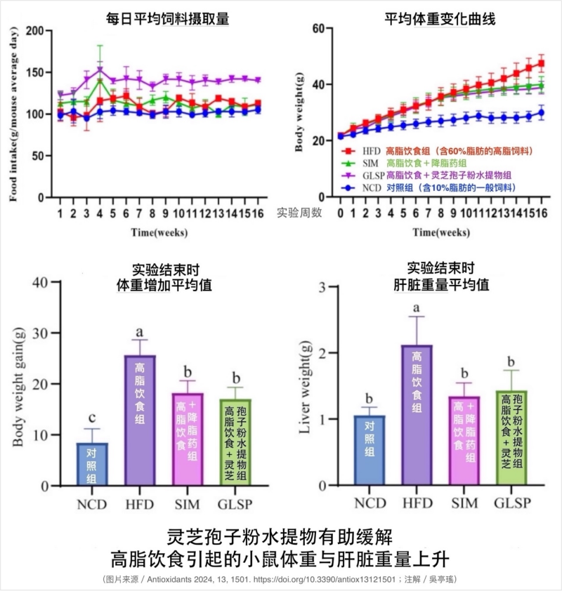 结果发现,虽然各组小鼠的饲料摄取量并没有显著差异,可是与代谢性脂肪肝病相关的体重增加、肝脏重量增加、甘油三酯和胆固醇在肝脏和血液里的含量增加等,都会因为有吃灵芝孢子粉水提物而减缓增加的幅度,而且效果甚至跟口服降脂药辛伐他汀不相上下(详如下图)。