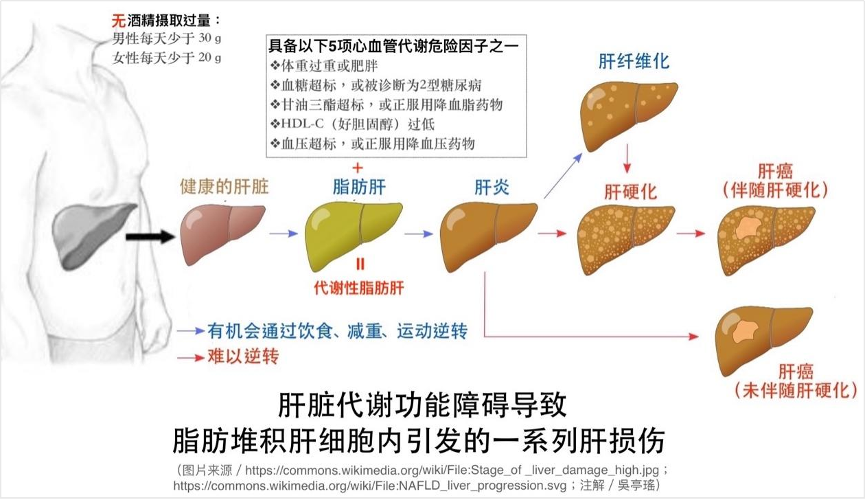 这类型脂肪肝病在过去称为“非酒精性脂肪肝病”(non-alcoholic fatty liver disease,简称NAFLD),近年则被医界更名为 “代谢性脂肪肝病”(metabolic dysfunction-associated steatotic liver disease,简称MASLD;或metabolic dysfunction-associated fatty liver disease,简称MAFLD),以更准确反映其背后的病理机制与防治需求。