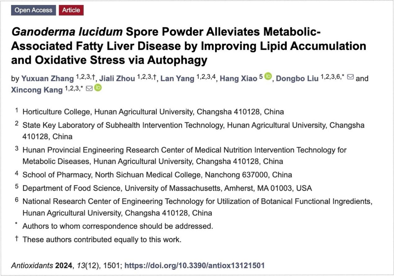 湖南农业大学园艺学院中药资源开发系讲师康信聪(Xincong Kang)博士,联手美国马萨诸塞大学阿莫斯特分校食品科学系Hang Xiao教授等研究者,共同发表在2024年12月号《Antioxidants》(抗氧化剂期刊)的研究即证明,灵芝(Ganoderma lucidum)孢子粉具有缓解代谢性脂肪肝病的潜力。