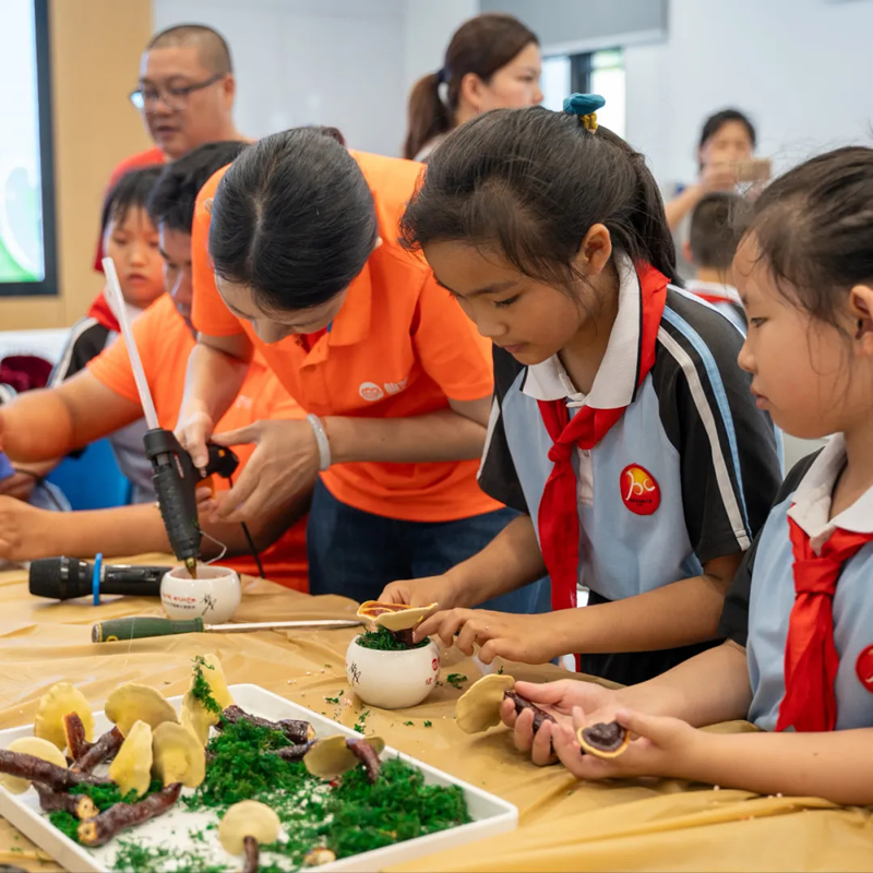 在灵芝盆景DIY环节,孩子们发挥创意,家长们在旁协助,将灵芝与苔藓巧妙组合,创作出各具特色的微型景观,温馨且美好。这份亲手制作的"自然礼物",不仅凝结着研学之旅的收获,更成为每个孩子心中最珍贵的成长印记。