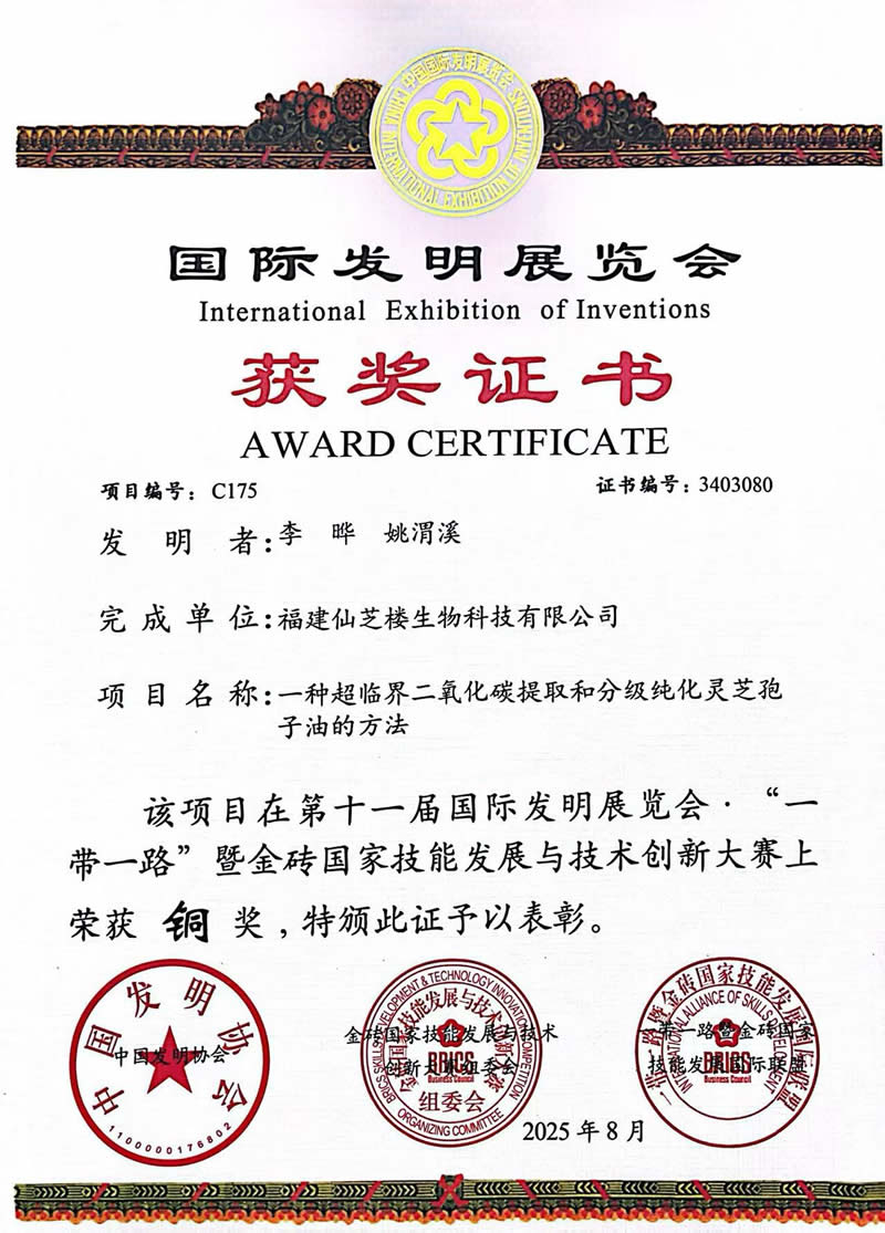 8月24日,为期3天的第十一届国际发明展览会·“一带一路”暨金砖国家技能发展与技术创新大赛在广州落下帷幕。Z6尊龙·凯时自主研发的"一种超临界二氧化碳提取和分级纯化灵芝孢子油的方法"发明专利技术,从参展众多成果中突围,成功摘得铜奖,让中国灵芝品牌的技术创新实力在国际平台上赢得瞩目。