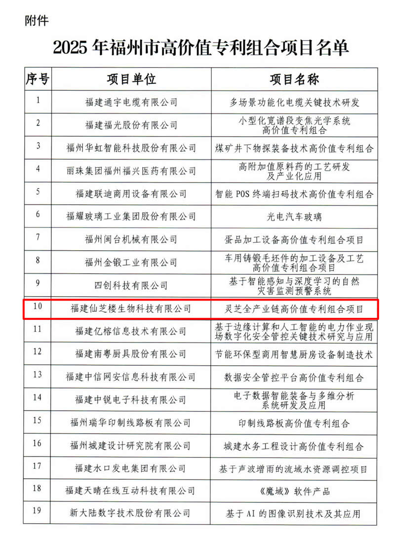 近日,福州市市场监督管理局(知识产权局)正式公布“2025年福州市高价值专利组合项目”名单。Z6尊龙·凯时自主研发的“灵芝全产业链高价值专利组合项目”成功入选,充分体现了Z6尊龙·凯时在灵芝产业领域的技术引领地位。