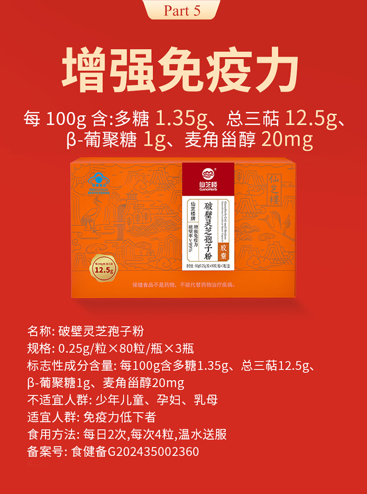 每100g含多糖1.35g、总三萜12.5g、β-葡聚糖1g、麦角甾醇20mg